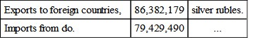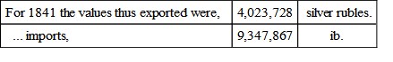 Add 11,808,743 rubles assignation for exports to, and 4,792,346 imports from, Poland and Finland in 1841, and the real comparison would be, for 1841, exports 314,146,349, imports 282,795,561; balance in favour of 1841, 31,350,688 rubles assignation.