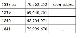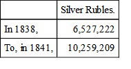 The revenue from customs in 1841 amounted to 27,387,494 silver rubles, or upwards of two-fifths in excess of the receipts of 1830.