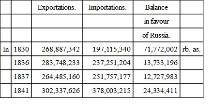 It is necessary, however, to travel more backwards in order to a right appreciation of the progress of the foreign trade of Russia. This comparison is here instituted with earlier years, premising that the exports to Poland and Finland, amounting to some ten or twelve millions of rubles assignation, and imports from, amounting to about three millions, are included, and therefore swell the amount of the imports and exports of the following years. However, to facilitate the comparison, the silver ruble values of 1841 are multiplied into corresponding ruble assignation values: