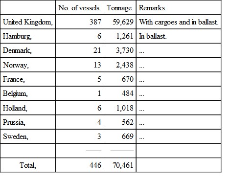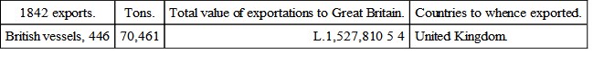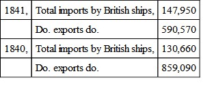In 1842, 174 British ships entered, tonnage 44,428, sailed 176 tonnage, 44929