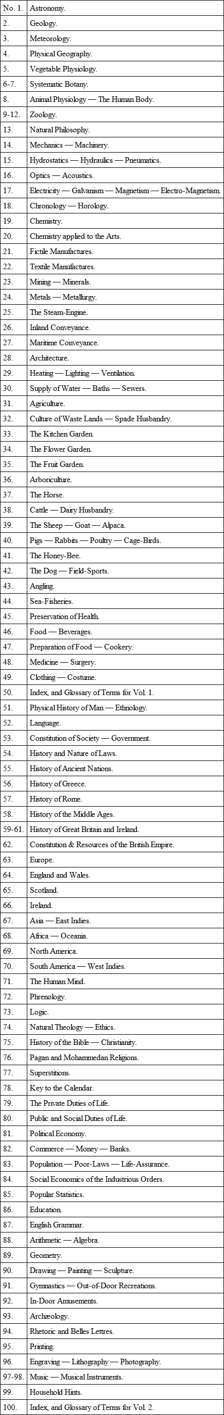 The following is the list of subjects of which the work is composed; each subject being generally confined to a single number. Price of each number 1½d. The work is largely illustrated with wood-engravings: —