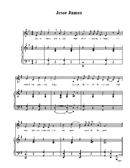 Jesse James was a lad that killed a-many a man;He robbed the Danville train.But that dirty little coward that shot Mr. HowardHas laid poor Jesse in his grave.Poor Jesse had a wife to mourn for his life,Three children, they were brave.But that dirty little coward that shot Mr. HowardHas laid poor Jesse in his grave.It was Robert Ford, that dirty little coward,I wonder how he does feel,For he ate of Jesse's bread and he slept in Jesse's bed,Then laid poor Jesse in his grave.Jesse was a man, a friend to the poor,He never would see a man suffer pain;And with his brother Frank he robbed the Chicago bank,And stopped the Glendale train.It was his brother Frank that robbed the Gallatin bank,And carried the money from the town;It was in this very place that they had a little race,For they shot Captain Sheets to the ground.They went to the crossing not very far from there,And there they did the same;With the agent on his knees, he delivered up the keysTo the outlaws, Frank and Jesse James.It was on Wednesday night, the moon was shining bright,They robbed the Glendale train;The people they did say, for many miles away,It was robbed by Frank and Jesse James.It was on Saturday night, Jesse was at homeTalking with his family brave,Robert Ford came along like a thief in the nightAnd laid poor Jesse in his grave.The people held their breath when they heard of Jesse's death,And wondered how he ever came to die.It was one of the gang called little Robert Ford,He shot poor Jesse on the sly.Jesse went to his rest with his hand on his breast;The devil will be upon his knee.He was born one day in the county of ClayAnd came from a solitary race.This song was made by Billy Gashade,As soon as the news did arrive;He said there was no man with the law in his handWho could take Jesse James when alive.