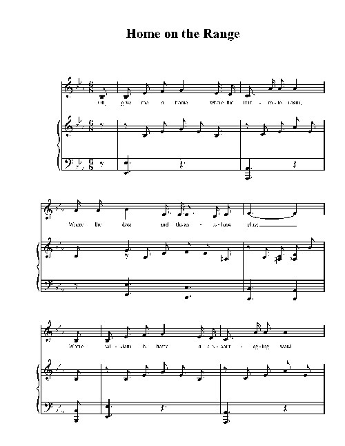 Oh, give me a home where the buffalo roam,Where the deer and the antelope play,Where seldom is heard a discouraging wordAnd the skies are not cloudy all day.Home, home on the range,Where the deer and the antelope play;Where seldom is heard a discouraging wordAnd the skies are not cloudy all day.Where the air is so pure, the zephyrs so free,The breezes so balmy and light,That I would not exchange my home on the rangeFor all of the cities so bright.The red man was pressed from this part of the West,He's likely no more to returnTo the banks of Red River where seldom if everTheir flickering camp-fires burn.How often at night when the heavens are brightWith the light from the glittering stars,Have I stood here amazed and asked as I gazedIf their glory exceeds that of ours.Oh, I love these wild flowers in this dear land of ours,The curlew I love to hear scream,And I love the white rocks and the antelope flocksThat graze on the mountain-tops green.Oh, give me a land where the bright diamond sandFlows leisurely down the stream;Where the graceful white swan goes gliding alongLike a maid in a heavenly dream.Then I would not exchange my home on the range,Where the deer and the antelope play;Where seldom is heard a discouraging wordAnd the skies are not cloudy all day.Home, home on the range,Where the deer and the antelope play;Where seldom is heard a discouraging wordAnd the skies are not cloudy all day.