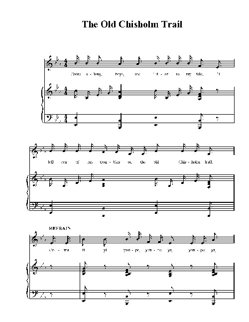 Come along, boys, and listen to my tale,I'll tell you of my troubles on the old Chisholm trail.Coma ti yi youpy, youpy ya, youpy ya,Coma ti yi youpy, youpy ya.I started up the trail October twenty-third,I started up the trail with the 2-U herd.Oh, a ten dollar hoss and a forty dollar saddle,—And I'm goin' to punchin' Texas cattle.I woke up one morning on the old Chisholm trail,Rope in my hand and a cow by the tail.I'm up in the mornin' afore daylightAnd afore I sleep the moon shines bright.Old Ben Bolt was a blamed good boss,But he'd go to see the girls on a sore-backed hoss.Old Ben Bolt was a fine old manAnd you'd know there was whiskey wherever he'd land.My hoss throwed me off at the creek called Mud,My hoss throwed me off round the 2-U herd.Last time I saw him he was going cross the levelA-kicking up his heels and a-running like the devil.It's cloudy in the West, a-looking like rain,And my damned old slicker's in the wagon again.Crippled my hoss, I don't know how,Ropin' at the horns of a 2-U cow.We hit Caldwell and we hit her on the fly,We bedded down the cattle on the hill close by.No chaps, no slicker, and it's pouring down rain,And I swear, by god, I'll never night-herd again.Feet in the stirrups and seat in the saddle,I hung and rattled with them long-horn cattle.Last night I was on guard and the leader broke the ranks,I hit my horse down the shoulders and I spurred him in the flanks.The wind commenced to blow, and the rain began to fall,Hit looked, by grab, like we was goin' to loss 'em all.I jumped in the saddle and grabbed holt the horn,Best blamed cow-puncher ever was born.I popped my foot in the stirrup and gave a little yell,The tail cattle broke and the leaders went to hell.I don't give a damn if they never do stop;I'll ride as long as an eight-day clock.Foot in the stirrup and hand on the horn,Best damned cowboy ever was born.I herded and I hollered and I done very well,Till the boss said, "Boys, just let 'em go to hell."Stray in the herd and the boss said kill it,So I shot him in the rump with the handle of the skillet.We rounded 'em up and put 'em on the cars,And that was the last of the old Two Bars.Oh it's bacon and beans most every day,—I'd as soon be a-eatin' prairie hay.I'm on my best horse and I'm goin' at a run,I'm the quickest shootin' cowboy that ever pulled a gun.I went to the wagon to get my roll,To come back to Texas, dad-burn my soul.I went to the boss to draw my roll,He had it figgered out I was nine dollars in the hole.I'll sell my outfit just as soon as I can,I won't punch cattle for no damned man.Goin' back to town to draw my money,Goin' back home to see my honey.With my knees in the saddle and my seat in the sky,I'll quit punching cows in the sweet by and by.Coma ti yi youpy, youpy ya, youpy ya,Coma ti yi youpy, youpy ya.