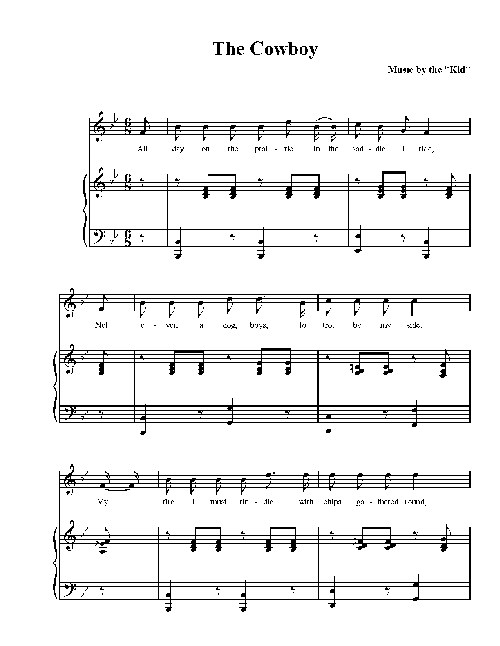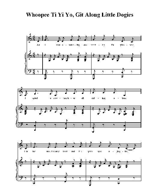 As I walked out one morning for pleasure,I spied a cow-puncher all riding alone;His hat was throwed back and his spurs was a jingling,As he approached me a-singin' this song,Whoopee ti yi yo, git along little dogies,It's your misfortune, and none of my own.Whoopee ti yi yo, git along little dogies,For you know Wyoming will be your new home.Early in the spring we round up the dogies,Mark and brand and bob off their tails;Round up our horses, load up the chuck-wagon,Then throw the dogies upon the trail.It's whooping and yelling and driving the dogies;Oh how I wish you would go on;It's whooping and punching and go on little dogies,For you know Wyoming will be your new home.Some boys goes up the trail for pleasure,But that's where you get it most awfully wrong;For you haven't any idea the trouble they give usWhile we go driving them all along.When the night comes on and we hold them on the bedground,These little dogies that roll on so slow;Roll up the herd and cut out the strays,And roll the little dogies that never rolled before.Your mother she was raised way down in Texas,Where the jimson weed and sand-burrs grow;Now we'll fill you up on prickly pear and chollaTill you are ready for the trail to Idaho.Oh, you'll be soup for Uncle Sam's Injuns;"It's beef, heap beef," I hear them cry.Git along, git along, git along little dogiesYou're going to be beef steers by and by.