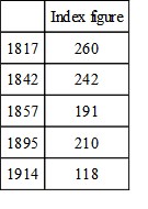 In the year 1920 the charge per head was £7.16 and my purchasing power index figure 629. You will see that the real burden in commodities moved down much less violently than the money burden, and the relief was not actually so great as it looks, because prices were far lower in 1914 than they were early in the nineteenth century.