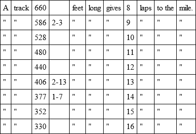 This table shows the kind of tracks to avoid as difficult to measure. They are the thirteen and fourteen-lap tracks, which contain fractions that involve a division of inches and are so far improper. All the others are easily measured.