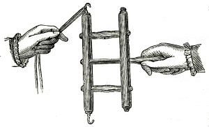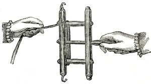 To make the fringe first twist together threads of claret-colored worsted. For this purpose use a wooden reel, the middle rod of which forms a movable handle. One side of the reel is furnished with brass hooks on the ends. Lay a thread of claret-colored worsted on the upper hook as shown by Fig. 2; turn the reel quickly, holding the thread double with the left hand and the handle of the reel with the right hand until the thread has been twisted long enough to be wound on the reel, with the hands in the position as shown by Fig. 3. When the threads have been twisted of sufficient length, wind them tight on a long wooden board four inches and seven-eighths in circumference (see Fig. 4), and for the heading of the fringe crochet on each thread 1 sc. (single crochet) with claret-colored worsted. Withdraw the board from the loops, twist these, and on the sc. work a second round of sc. with similar worsted, at the same time fastening in a chain stitch foundation worked with écru cotton. In doing this, work alternately 2 sc. on the foundation and 2 sc. without the foundation.
