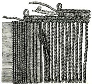 Another simple fringe is made by winding the worsted on a suitable-sized book, then cutting it through on one end, and knotting strands of four threads each into the edge of the rug.