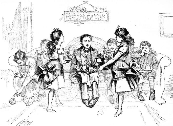 New-Year's Gifts.—The custom of giving and receiving gifts at the new year dates from very early times indeed. The Druids used to cut down branches of their sacred mistletoe with a golden knife, and distribute them amongst the people as New-Year's gifts. As they cut it down they used to sing—