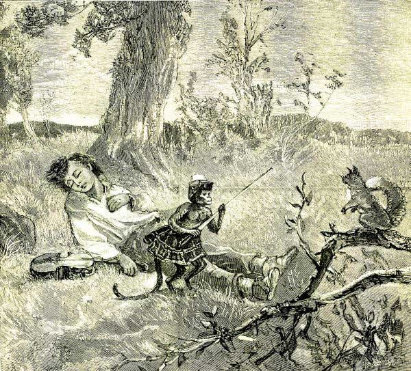 Halt! Not a step farther! Don't move for your life!You're a very nice squirrel, I haven't a doubt(Although you've forgotten, I see, to put onYour kilt and your jacket before you came out),But where you now are you must stop for an hourOr two, and quite silent meanwhile you must keep,For a weary long way we have travelled to-day,And my dear little master lies there fast asleep.Of course you don't know—you've grown up in the woods,With no one to teach you—how fine 'tis to beGreat artists as we are! You've heard but the birds,And seen only squirrels jump round in a tree.My master the sweetest of music can make(Sh! you rustled a leaf—he half-opened his eyes),And a gun I can handle, a drum I can beat,And I dance like a fairy—I tell you no lies.My dear little master! full oft he has shared,Bite for bite, with me, squirrel, his very last crust,And he's patiently carried me many a mile,And that now I guard him I am sure is but just.Curl your tail up still tighter, and don't let it fallLest a noise it should make—it's remarkably big—And, if you are good, by-and-by we may allHave a right merry tune and a right merry jig.THE LITTLE GENIUS