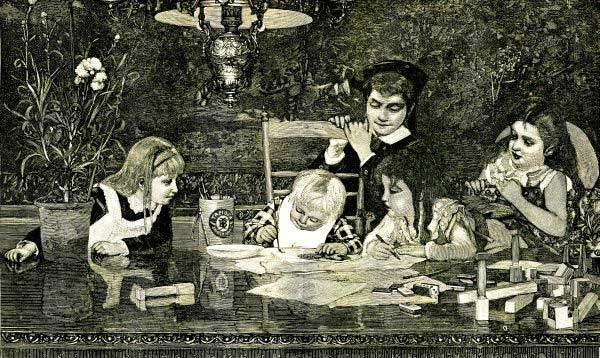 Little five-year-old Bertie was very fond of sitting at the study table with his brothers and sisters, especially when they were doing their drawing lessons. But he was not satisfied with watching them. He too wanted to draw and paint, and the older children, who were very fond of him, were always glad to indulge him by lending him their brushes, paints, and pencils. But they soon found that he was very wasteful of their materials, and would use up colors and paper faster than they could be supplied. At last they thought of a better plan. As Bertie was too young to draw nicely, they bought him some wonderful picture-books, all in outline, a box of cheap water-colors, and some brushes. Then Bertie was happy. He would sit for hours painting the pictures in Jack the Giant-killer, Mother Goose, and other story-books for little folks. When he had finished all his little books his mamma brought out some old papers which she had saved, and cutting out the nice pictures, gave them to him to paint. This he did very beautifully. Sometimes he would make funny mistakes, putting green on the horses, and blue on the little dogs and pussy-cats, but this did not happen often. In a little while he had so many nice things painted that his sisters made him a big scrap-book to keep them in, to look at when he grows up.
