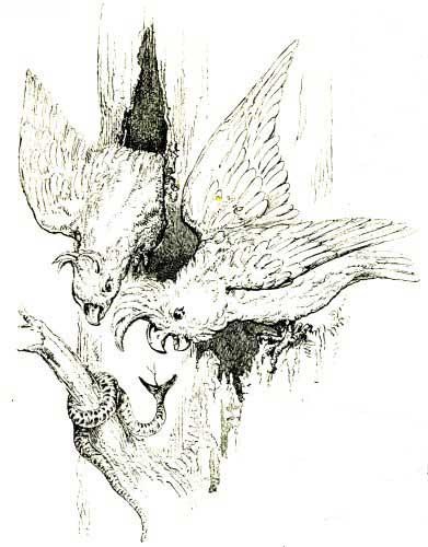 Our life was indeed peaceful, although we were subject at times to some anxiety from the attacks of certain wicked creatures which haunted the shores of our beautiful river. I remember, as if it had taken place yesterday, what happened one beautiful morning while papa had gone out to find our breakfast. Mamma had nestled down with us, and had soothed us into taking a little nap, when we were all startled by loud, shrill cries. Mamma recognized papa's voice at once. She was naturally very brave, and I think, to protect her children, she would have flown in the face of a lion. She now rushed to the door of our nest, where she stood, her feathers bristling, ready to give fight to whatever might try to enter. As she filled the whole doorway with her spread wings, we could not peep out to see what was the danger, although we stood on tiptoe and tried with all our strength to push our heads through her feathers. She gave us some smart taps with her claw, and ordered us back to the interior of the nest; and when she at length told us in a frightened whisper that papa was fighting with a ferocious serpent, we huddled together as close as we could in the very bottom of our hole. We knew that serpents murdered young parrots and ate them, for only the day before we had heard a neighbor telling mamma that one of these monsters had eaten six little parrots, children of a dear friend of hers, for his breakfast. Although mamma had said, after she went away, that she was only a gossip, and said such things to frighten us, now we were sure it was the truth, and we expected to see the serpent's head thrust into our nest, his mouth open to devour us. My brother and sister were half dead with fright. I tried to cheer them, assuring them that papa was strong enough to drive away a whole army of monsters, and when mamma suddenly flew away from the door, I crept up cautiously and peeped out. What was my relief to see papa flying rapidly toward the river, with an enormous serpent hanging dead in his claws! I screamed the good news to my brother and sister, but they refused to be comforted. In vain I assured them that the danger was over, that the serpent was conquered—was dead, in fact;—and that papa had thrown the loathsome body into the river, that we might not be frightened at the horrible sight. My brother and sister continued crying and trembling until papa and mamma returned.