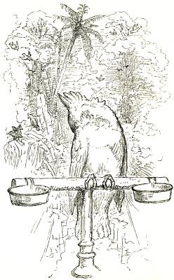 "Are you happy?" my master would say. "Have you eaten your breakfast, Lorito?" Yes, indeed, I had breakfasted. I did nothing but eat breakfast from morning till night. I grew very fat, and what was worse, I became so stupid that I repeated like an echo all my master's words. "Have you eaten your breakfast?" I would scream; and my master would laugh, and toss me a lump of sugar. That was my only recreation—to repeat my master's words and eat sugar. I was gradually losing all sense of honor and truth, and to be praised and get a lump of sugar I would rest my beak in my claw and say, with a languishing air, "My head aches; let me alone." My head did ache, too, sometimes, remembering the days when I knew only the language of my fathers, when the sweet voice of my mother waked me in the morning to pass a happy day playing with my brother and sister. Solitude and confinement had soured my character. The rings of my chain hurt my feet so that they were becoming swelled and inflamed. I hated all the world. When my master filled my feed dish with dainties, instead of gratefully accepting his kindness I would seize the dish and spitefully overturn its contents. All day long I screamed as loud as I could, and it gave me the greatest satisfaction when once a policeman came running in great haste to inquire of the house-maid if there was any trouble. "That horrid parrot!" I heard her say, and I laughed as loud as I had screamed before.