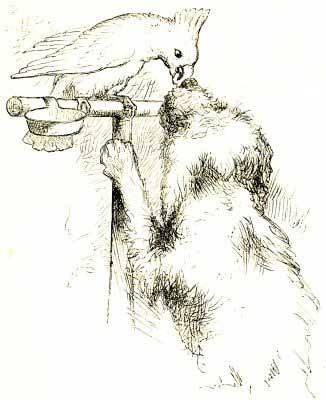 It was now decided to try water on my feathers, and Louis, putting me on his shoulder, carried me to the bath-room. I did feel the greatest inclination to bite his ear, but I contented myself by gently pulling his hair, which made him laugh.