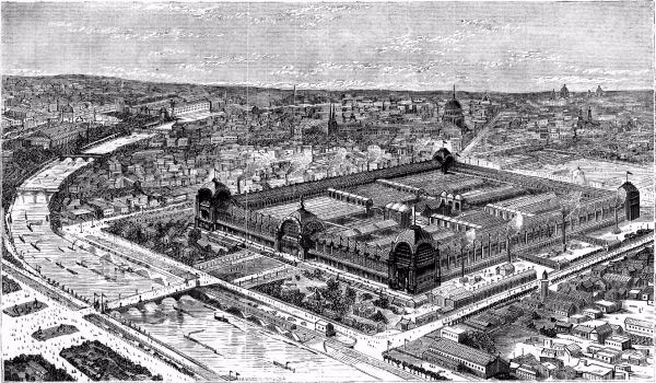 The balcony of the Trocadéro facing toward the river and the Champ de Mars affords the most extensive view obtainable in the grounds. Beneath is the cascade with its basins and fountains, and spreading away on each side is the garden with its various national buildings, neat, gaudy or grotesque. Spanning the invisible roads and river is the broad Pont d'Iéna, and then comes a repetition of the garden, the sward dotted with parterres and buildings. A broad terrace, crowned with the splendid façade of the main building, does not quite terminate the view, for from the height of the lower corridor of the rotunda the buildings of Paris are seen to stretch away in the distance. The hill of Montmartre on the north and the heights of Chatillon and Clamart on the south terminate the view in those directions.