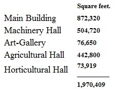 A few figures, dry enough in themselves if there were nothing more, will serve as a means of comparison of the relative spaces under cover. The building on the Champ de Mars is stated officially to be 650 mètres long by 350 mètres broad, which, reduced to our measurement, will give 2,447,536 square feet. Deducting 150,000 feet for two enclosed alleys, the area under roof will be 2,297,536 feet. The area of the five principal buildings at the Centennial Exhibition was: