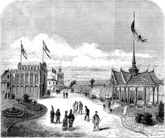 Anam, Persia, Siam, Morocco and Tunis have unitedly a gingerbread affair of four distinct patterns—we cannot call them styles. Siam in the centre has a chocolate-colored tower picked out with silver, and surmounted by a triple pagoda roof, whence floats the flag, a white elephant in a red field. The six feet of homeliness belonging to Tunis has a balcony of wood which neither reveals nor hides the almond-eyed whose supposed relatives are selling trumpery in booths on the other side of the Seine.