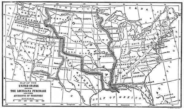 MAP OF THE UNITED STATES SHOWING THE LOUISIANA PURCHASE AND OTHER ACCESSIONS OF TERRITORY.