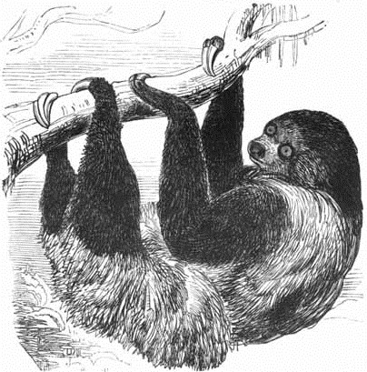 The Sloth, in its wild condition, spends its whole life on the trees, and never leaves them but through force or accident; and, what is more extraordinary, it lives not upon the branches, like the squirrel and the monkey, but under them. Suspended from the branches, it moves, and rests, and sleeps. So much of its anatomical structure as illustrates this peculiarity it is necessary to state. The arm and fore-arm of the sloth, taken together, are nearly twice the length of the hind legs; and they are, both by their form and the manner in which they are joined to the body, quite incapacitated from acting in a perpendicular direction, or in supporting it upon the earth, as the bodies of other quadrupeds are supported by their legs. Hence, if the animal be placed on the floor, its belly touches the ground. The wrist and ankle are joined to the fore-arm and leg in an oblique direction; so that the palm or sole, instead of being directed downwards towards the surface of the ground, as in other animals, is turned inward towards the body, in such a manner that it is impossible for the sloth to place the sole of its foot flat down upon a level surface. It is compelled, under such circumstances, to rest upon the external edge of the foot. This, joined to other peculiarities in the formation, render it impossible for sloths to walk after the manner of ordinary quadrupeds; and it is indeed only on broken ground, when he can lay hold of stones, roots of grass, &c., that he can get along at all. He then extends his arms in all directions in search of something to lay hold of; and when he has succeeded, he pulls himself forward, and is then enabled to trail himself along in the exceedingly awkward and tardy manner which has procured for him his name.