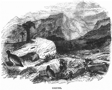 We have but few European birds presenting more points of interest in their history than the Grouse, a species peculiar to the northern and temperate latitudes of the globe. Dense pine forests are the abode of some; others frequent the wild tracts of heath-clad moorland, while the patches of vegetation scattered among the rocky peaks of the mountains, afford a congenial residence to others. Patient of cold, and protected during the intense severities of winter by their thick plumage, they give animation to the frozen solitude long after all other birds have retired from the desolate scenery. Their food consists of the tender shoots of pines, the seeds of plants, the berries of the arbutus and bilberry, the buds of the birch and alder, the buds of the heather, leaves, and grain. The nest is very simply constructed, consisting of dried grasses placed upon the ground and sheltered among the herbage.