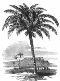 These beautiful trees may be ranked among the noblest specimens of vegetation; and their tall, slender, unbranched stems, crowned by elegant feathery foliage, composed of a cluster of gigantic leaves, render them, although of several varieties, different in appearance from all other trees. In some kinds of palm the stem is irregularly thick; in others, slender as a reed. It is scaly in one species, and prickly in another. In the Palma real, in Cuba, the stem swells out like a spindle in the middle. At the summit of these stems, which in some cases attain an altitude of upwards of 180 feet, a crown of leaves, either feathery or fan-shaped (for there is not a great variety in their general form), spreads out on all sides, the leaves being frequently from twelve to fifteen feet in length. In some species the foliage is of a dark green and shining surface, like that of a laurel or holly; in others, silvery on the under-side, as in the willow; and there is one species of palm with a fan-shaped leaf, adorned with concentric blue and yellow rings, like the "eyes" of a peacock's tail.