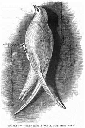 How curious is the structure of the nest of the goldfinch or chaffinch! The inside of it is lined with cotton and fine silken threads; and the outside cannot be sufficiently admired, though it is composed only of various species of fine moss. The colour of these mosses, resembling that of the bark of the tree on which the nest is built, proves that the bird intended it should not be easily discovered. In some nests, hair, wool, and rushes are dexterously interwoven. In some, all the parts are firmly fastened by a thread, which the bird makes of hemp, wool, hair, or more commonly of spiders' webs. Other birds, as for instance the blackbird and the lapwing, after they have constructed their nest, plaster the inside with mortar, which cements and binds the whole together; they then stick upon it, while quite wet, some wool or moss, to give it the necessary degree of warmth. The nests of swallows are of a very different construction from those of other birds. They require neither wood, nor hay, nor cords; they make a kind of mortar, with which they form a neat, secure, and comfortable habitation for themselves and their family. To moisten the dust, of which they build their nest, they dip their breasts in water and shake the drops from their wet feathers upon it. But the nests most worthy of admiration are those of certain Indian birds, which suspend them with great art from the branches of trees, to secure them from the depredations of various animals and insects. In general, every species of bird has a peculiar mode of building; but it may be remarked of all alike, that they always construct their nests in the way that is best adapted to their security, and to the preservation and welfare of their species.