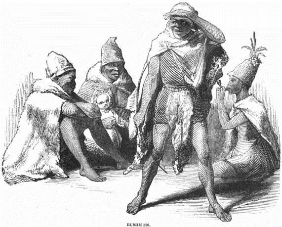 A group of Bosjesmans, comprising two men, two women, and a child, were recently brought to this country and exhibited at the Egyptian Hall, in Piccadilly. The women wore mantles and conical caps of hide, and gold ornaments in their ears. The men also wore a sort of skin cloak, which hung down to their knees, over a close tunic: the legs and feet were bare in both. Their sheep-skin mantles, sewed together with threads of sinew, and rendered soft and pliable by friction, sufficed for a garment by day and a blanket by night. These Bosjesmans exhibited a variety of the customs of their native country. Their whoops were sometimes so loud as to be startling, and they occasionally seemed to consider the attention of the spectators as an affront.