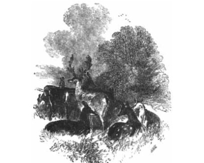 What sounds are on the mountain blast,Like bullet from the arbalast?Was it the hunted quarry pastRight up Ben-ledi's side?So near, so rapidly, he dash'd,Yon lichen'd bough has scarcely plash'dInto the torrent's tide.Ay! the good hound may bay beneath,The hunter wind his horn;He dared ye through the flooded Teith,As a warrior in his scorn!Dash the red rowel in the steed!Spur, laggards, while ye may!St. Hubert's staff to a stripling reed,He dies no death to-day!"Forward!" nay, waste not idle breath,Gallants, ye win no greenwood wreath;His antlers dance above the heath,Like chieftain's plumed helm;Right onward for the western peak,Where breaks the sky in one white streak,See, Isabel, in bold relief,To Fancy's eye, Glenartney's chief,Guarding his ancient realm.So motionless, so noiseless there,His foot on rock, his head in air,Like sculptor's breathing stone:Then, snorting from the rapid race,Snuffs the free air a moment's space,Glares grimly on the baffled chase,And seeks the covert lone.Hunting has been a favourite sport in Britain for many centuries. Dyonisius (B.C. 50) tells us that the North Britons lived, in great part, upon the food they procured by hunting. Strabo states that the dogs bred in Britain were highly esteemed on the Continent, on account of their excellent qualities for hunting; and Caesar tells us that venison constituted a great portion of the food of the Britons, who did not eat hares. Hunting was also in ancient times a Royal and noble sport: Alfred the Great hunted at twelve years of age; Athelstan, Edward the Confessor, Harold, William the Conqueror, William Rufus, and John were all good huntsmen; Edward II. reduced hunting to a science, and established rules for its practice; Henry IV. appointed a master of the game; Edward III. hunted with sixty couples of stag-hounds; Elizabeth was a famous huntswoman; and James I. preferred hunting to hawking or shooting. The Bishops and Abbots of the middle ages hunted with great state. Ladies also joined in the chase from the earliest times; and a lady's hunting-dress in the fifteenth century scarcely differed from the riding-habit of the present day.