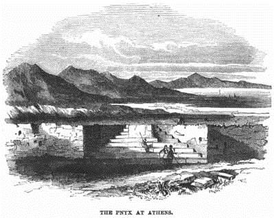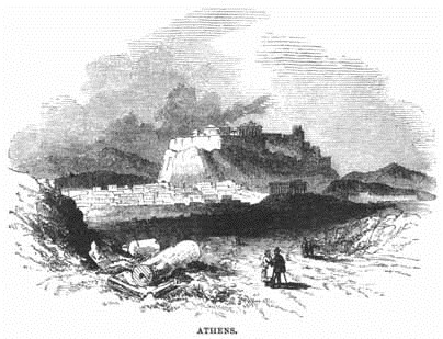 At the close of the late Greek war Athens was in a dreadful state, being little more than a heap of ruins. It was declared by a Royal ordinance of 1834 to be the capital of the new kingdom of Greece, and in the March of that year the King laid the foundation-stone of his palace there. In the hill of Areopagus, where sat that famous tribunal, we may still discover the steps cut in the rock by which it was ascended, the seats of the judges, and opposite to them those of the accuser and accused. This hill was converted into a burial-place for the Turks, and is covered with their tombs.