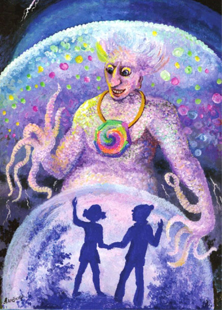 И вдруг всё происходящее в нижней половине шара замерло и стало, бурля, превращаться в некое подобие существа, медленно выныривающего из этого сверкающего водоёма. Удлинённое узкое лицо с крючковатым носом, выпуклыми глазами, покатым лбом, провисшими ушами, с большим разрезом рта, где, словно кривым частоколом, торчали зубы. Волосы на голове вроде были и вроде как нет – вся верхушка головы была похожа на полуобдутый ветром одуванчик. И всё это, медленно вытягиваясь из приплюснутого шара, сверкая, вибрировало, скрежетало и верещало, как будто некто невидимый, быстро-быстро всё это скрепляя, зажимал, прикручивал и выдувал.