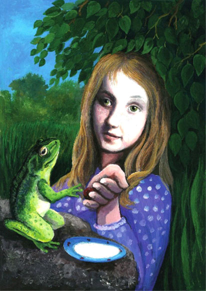 Подойдя к реке, Катя увидела на большом сером валуне большую зелёную лягушку со странно вывернутой немножечко в сторону лапкой. Лягушка как будто собиралась вот-вот что-нибудь схватить и бросить в непрошеного посетителя. Она была важно сосредоточенна, глаза выпучены, а белая грудка так и колыхалась от возмущения. Вся эта увиденная сцена показалась Кате такой смешной и забавной, что, подойдя поближе, почти к самой воде, присев на корточки и вдоволь насмеявшись, девочка спросила: «Тебя как зовут?»