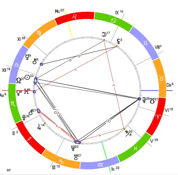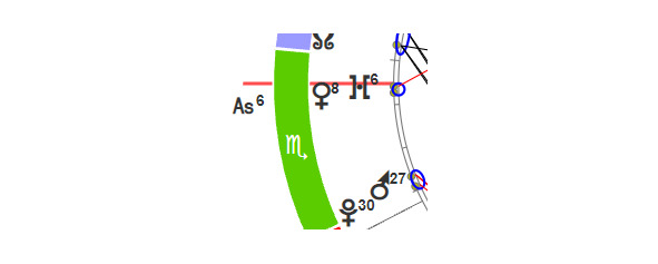 Кстати, цвета стихий вы можете увидеть на натальной карте – в данном примере мы видим, что огненная стихия – это красный цвет, воздушная – голубой, водная – зелёный и земная – оранжевый. Здесь мы видим Асцендент в зелёном секторе (знак Скорпиона), а Десцендент – в оранжевом (Телец).
