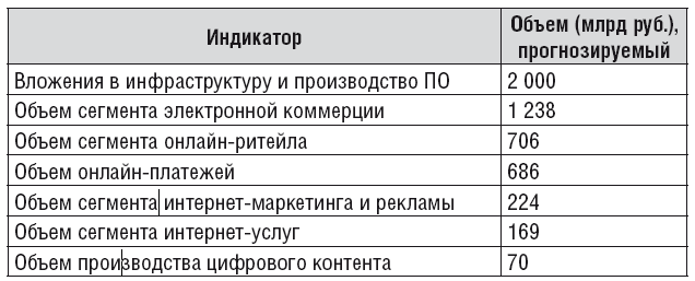 Согласно данным Российской ассоциации электронных коммуникаций (РАЭК), вклад цифровой экономики в экономику России в настоящее время можно оценить через долю Рунета в экономике страны, составляющую 2,8 % от ВВП, если брать собственно интернет-рынки, и 19 % от ВВП, если учитывать рынки, зависимые от Интернета, при этом объем кадров, занятых в индустрии Рунета, достигает 2,5 млн работников. Объем некоторых финансовых показателей, характеризующих финансовые индикаторы цифровой экономики, приведен в таблице 1.