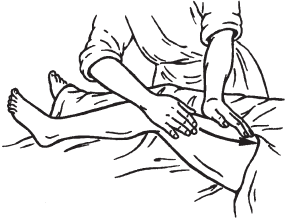 7. При нарушении кровообращения (припухлости, отеке) все поглаживания проводят по отсасывающей методике: начинают с находящихся выше участков, на пример, при процессе на голеностопном суставе – с бедра, затем массируют голень и только потом голеностопный сустав, все движения – по направлению к паховому лимфатическому узлу.