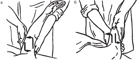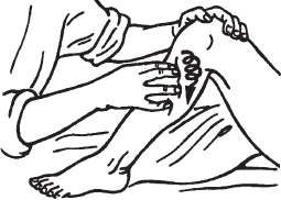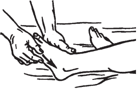Встряхивание выполняется обеими кистями или одной с фиксацией кисти или голеностопного сустава массируемого. Этот прием проводится только на верхних и нижних конечностях. При применении его на верхних конечностях производят «рукопожатие» и встряхивание в горизонтальной плоскости. На нижних конечностях встряхивание выполняется в вертикальной плоскости с фиксацией голеностопного сустава. При этом коленный сустав должен быть выпрямлен (рис. 46).