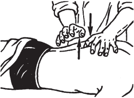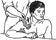 Надавливание выполняется пальцем или кулаком, основанием ладони, можно с отягощением. Применяется в области спины, вдоль паравертебральной линии, в области ягодиц, в местах окончаний отдельных нервных стволов (в зоне расположения БАТ) (рис. 41).