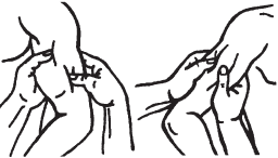Сдвигание – зафиксировав массируемую поверхность, производят короткие ритмичные движения, сдвигая ткани друг к другу. Противоположные действия называются растяжением. Применяются при рубцах, при лечении кожных заболеваний (псориаз и др.), при сращениях, парезах, на лице и других областях. Чаще выполняются двумя руками, двумя пальцами или несколькими пальцами (рис. 40).