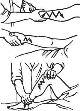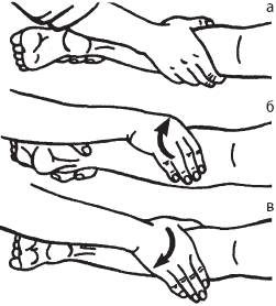 Рис. 37. Поперечное разминание одной рукой: а – фаза фиксации; б – фаза сдавливания; в – раздавливание (раскатывание)