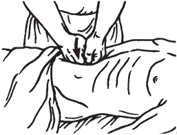 Накатывание – захватив одной кистью массируемую область, другой делают накатывающие движения, перемещая расположенные рядом ткани на фиксирующую кисть, и так передвигаются по массируемому участку. Накатывающие движения можно производить на отдельные пальцы, кулак. Применяются на животе, груди, на боковых поверхностях спины (рис. 39).