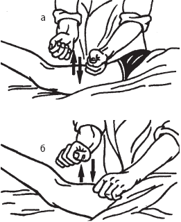 Рис. 49. Поколачивание: а – локтевым краем кисти; б – тыльной стороной согнутых пальцев
