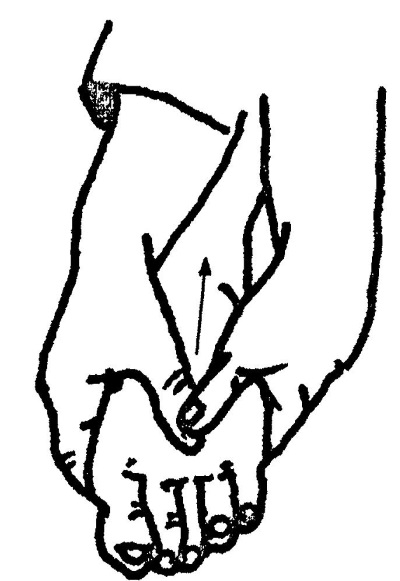Прием пальцевого точечного массажа специальный щипцеобразный – сжатие, резкое вонзание. Данный прием применяется также с целью стимуляции, тонизирования. Выполняется несколькими пальцами (чаще вторым и первым) или одним. Проекцию точки фиксируют между пальцами (например, – ЦЗЯНЬ-ЦЗИН, или сопряженные НЭЙ-ГУАНЬ + ВАЙ-ГУАНЬ, или ДА-ЛИН + ЯН-ЧИ и другие ДА-ЧЖУН + ШЭНЬ-МАЙ), при этом выполняют вонзающие движения одновременно на соответствующие фиксируемые точки, достигая требуемого эффекта действия. Данный прием выполняют с целью купирования приступа удушья, при состоянии расслабленности, при обморочном состоянии. В некоторых рекомендациях подобные приемы сравнивают с действием клешней рака или щипцами, прием напоминает укол (рис. 14).
