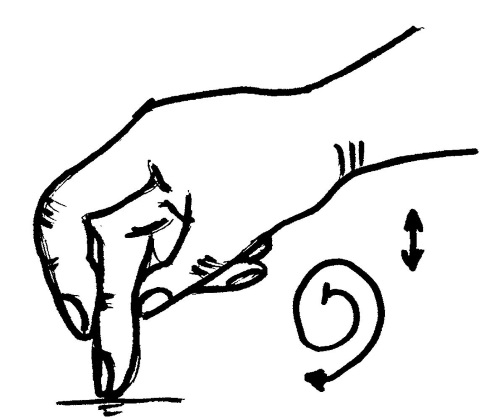 Есть так называемые специальные приемы, помогающие локально воздействовать на отдельные участки поверхности тела массируемого. Так, например, прием седативного, расслабляющего действия – ввинчивание и вывинчивание на поверхности локализации точки без отрыва от данной поверхности. Он выполняется концевой фалангой одного или нескольких пальцев, иногда с отягощением. Сперва движения выполняют по часовой стрелке, затем следует остановка поступательного надавливания с фиксацией на 1–2 сек, а затем начинается движение обратное – вывинчивание с ослаблением надавливания, но без отрыва от массируемой поверхности. Цикл движения повторяется в зависимости от рекомендации по временному фактору воздействия, например, если манипуляция производится в течение 30 сек – то следуют 2 входа и выхода на точке, если 2 минуты – то до 8 раз. Это позволяет четко дозировать процедуру согласно рекомендуемой методике и получать требуемый эффект (рис. 12).