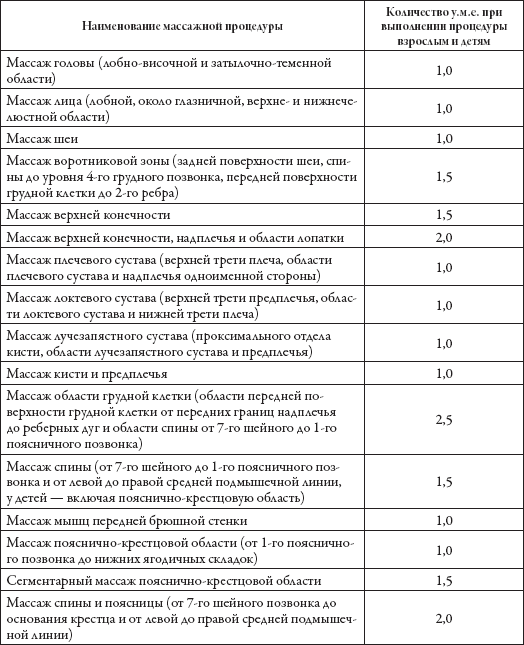 ПРИМЕЧАНИЯ: 1. За 1 условную массажную единицу (у.м.е.) принята массажная процедура (непосредственное проведение массажа), на выполнение которой требуется 10 мин. 2. Время переходов (переездов) для выполнения массажных процедур вне кабинета учитывается в условных массажных единицах по фактическим затратам. 3. Указанные нормы не могут служить основанием для установления штатов и расчетов по заработной плате, кроме случаев, специально оговоренных в действующих штатных нормативах и условиях оплаты труда медсестер по массажу.