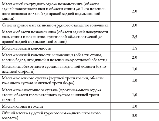 Курс массажа условно делится на 3 периода: 1) вводный – 1–3 процедуры, необходимые для выяснения ответной реакции организма на массаж (уменьшение боли, появление сонливости, легкости и свободы движений). В этом периоде выясняют переносимость отдельных массажных манипуляций, стремятся воздействовать на весь организм в целом, не выделяя рефлекторные области; 2) основной – начиная с 3–4-й и до 20–23-й процедуры применяют строго дифференцированную методику массажа с учетом клинической картины, физиологического состояния массируемого и особенностей его заболевания, обращая при этом внимание на функциональные изменения в массируемых областях тела. В этом периоде постепенно от процедуры к процедуре увеличивают интенсивность воздействия; 3) заключительный – состоит из 1–2 процедур, если это необходимо, можно обучить пациента самомассажу, показав рациональный комплекс и последовательность приемов для отдельных областей тела, выполнению дыхательных упражнений, а также рекомендовать физические упражнения для самостоятельных занятий с применением массажеров, массажных аппаратов и бальнеологических процедур. Норма времени по массажу определяется продолжительностью в минутах или по количеству массажных единиц на данную процедуру (табл. 3).