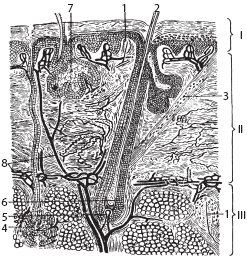 1 – нервные рецепторы; 2 – волос; 3 – мышца, поднимающая волос; 4 – потовая железа; 5 – волосяной сосочек; 6 – волосяная луковица; 7 – сальная железа; 8 – кровеносные сосуды