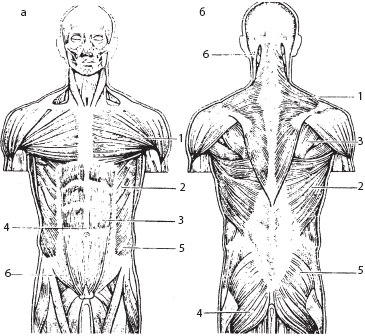 а – вид спереди: 1 – большая грудная мышца; 2 – передняя зубчатая мышца; 3 – прямая мышца живота; 4 – белая линия живота; 5 – наружная косая мышца живота; 6 – паховая связка; б – вид сзади: 1 – трапециевидная мышца; 2 – широчайшая мышца спины; 3 – большая ромбовидная мышца; 4 – средняя ягодичная мышца; 5 – большая ягодичная мышца; 6 – грудино-ключично-сосцевидная мышца