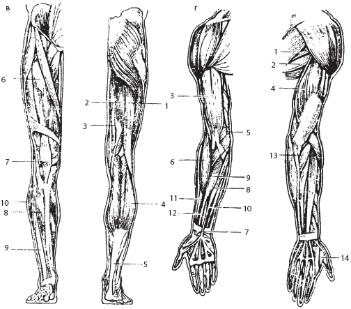в – мышцы нижней конечности: 1 – двуглавая мышца бедра; 2 – полусухожильная мышца; 3 – полуперепончатая мышца; 4 – икроножная мышца; 5 – пяточное сухожилие; 6 – четырехглавая мышца бедра; 7 – собственная связка надколенника; 8 – передняя большеберцовая мышца; 9 – длинный разгибатель пальцев; 10 – длинная малоберцовая мышца; г – мышцы верхней конечности: 1 – малая круглая мышца; 2 – большая круглая мышца; 3 – двуглавая мышца плеча; 4 – трехглавая мышца плеча; 5 – плечевая мышца; 6 – плечелучевая мышца; 7 – сухожилие поверхностного сгибателя пальцев; 8, 10 – поверхностный сгибатель пальцев; 9 – лучевой сгибатель кисти; 11 – лучевой сгибатель запястья; 12 – сухожилие лучевого сгибателя кисти; 13 – локтевая мышца; 14 – короткий разгибатель большого пальца кисти