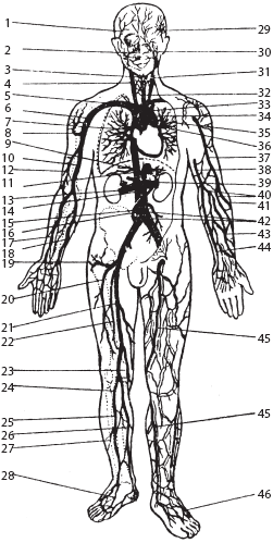 1 – поверхностная височная артерия; 2 – лицевая артерия, 3 – позвоночная артерия; 4 – общая сонная артерия; 5 – подключичные артерии и вена; 6 – подкрыльцовые артерия и вена; 7 – корень легкого, 8 – артерии, питающие плечевую кость; 9 – печеночные вены, 10 – плечевая артерия; 11 – чревный ствол; 12 – глубокая артерия плеча; 13 – верхняя брыжеечная артерия; 14 – брюшная часть аорты, 15 – нижняя брыжеечная артерия; 16 – нижняя полая вена; 17 – лучевая артерия; 18 – локтевая артерия; 19 – глубокая артерия, огибающая подвздошную кость, 20 – латеральная артерия, огибающая бедренную кость, 21 – бедренные артерия и вена; 22 – глубокая артерия бедра; 23, 24 – подколенная артерия; 25 – передняя большеберцовая артерия; 26 – задняя большеберцовая артерия, 27 – малоберцовая артерия; 28 – тыльная артерия стопы, 29 – поверхностная височная вена, 30 – лицевая вена; 31 – наружная яремная вена; 32 – внутренняя яремная вена; 33 – верхняя полая вена; 34 – дуга аорты, 35 – легочный ствол; 36 – легочные вены; 37 и 41 – латеральная подкожная вена руки; 38 и 44 – медиальная подкожная вена руки; 39 – почечные вены и артерии; 40 – промежуточная вена локтя; 42 – общие подвздошные артерия и вена; 43 – промежуточная вена предплечья; 45 – поверхностные вены бедра и голени; 46 – тыльная венозная сеть стопы локтя