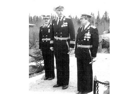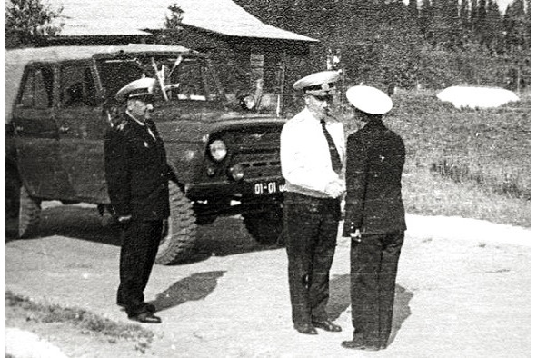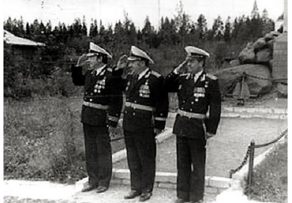 Начальник радиостанции капитан 1 ранга Карповский Б. Г. (слева), гл. инженер кап. 2 ранга Ряснянский Е. А. и зам. командира по политчасти подполковник Вязовкин А. А.